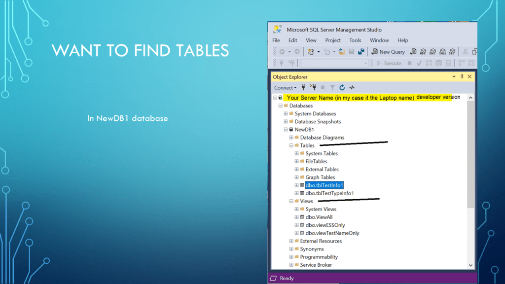 •Help from ref site: https://stackoverflow.com/questions/6671067/retrieve-list-of-tables-from-specific-database-on-server-c-sharp/6671427#6671427 it’s solution with a green check