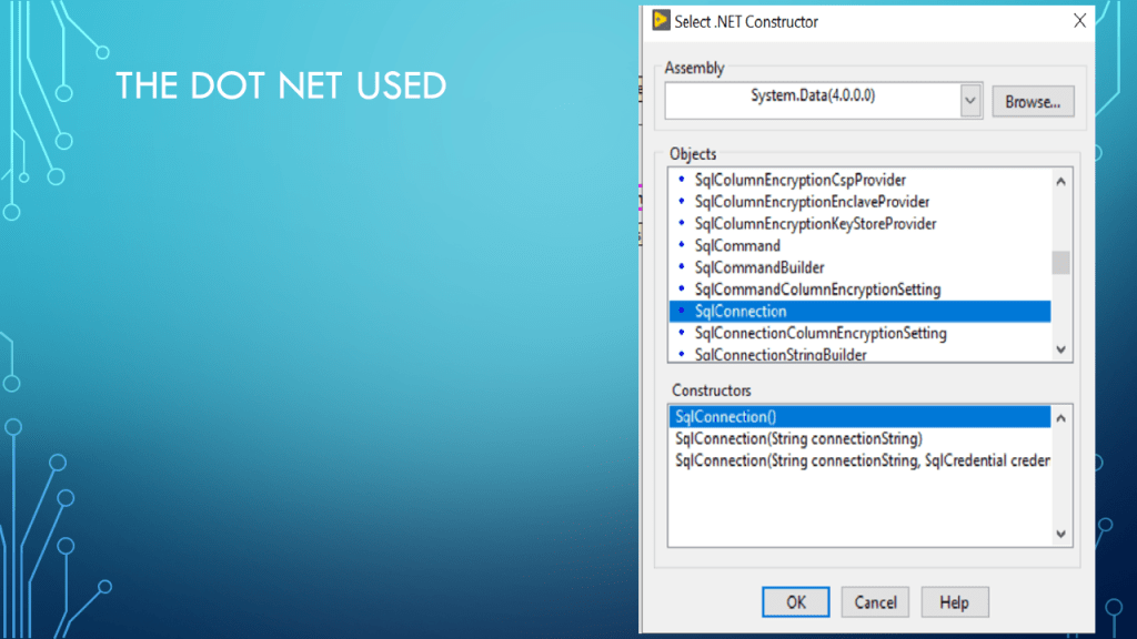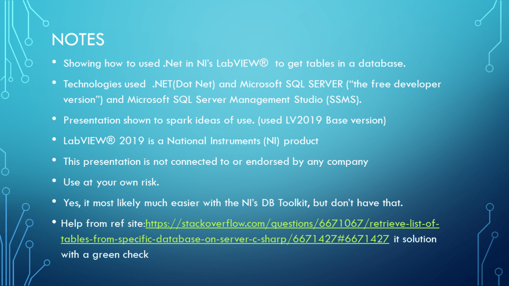 •Showing how to used .Net in NI’s LabVIEW® to get tables in a database.