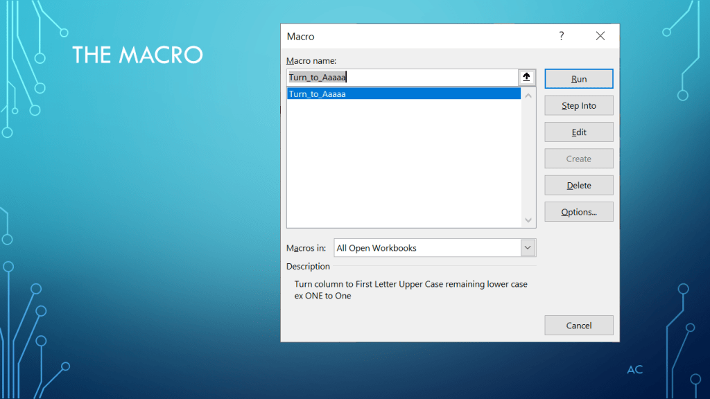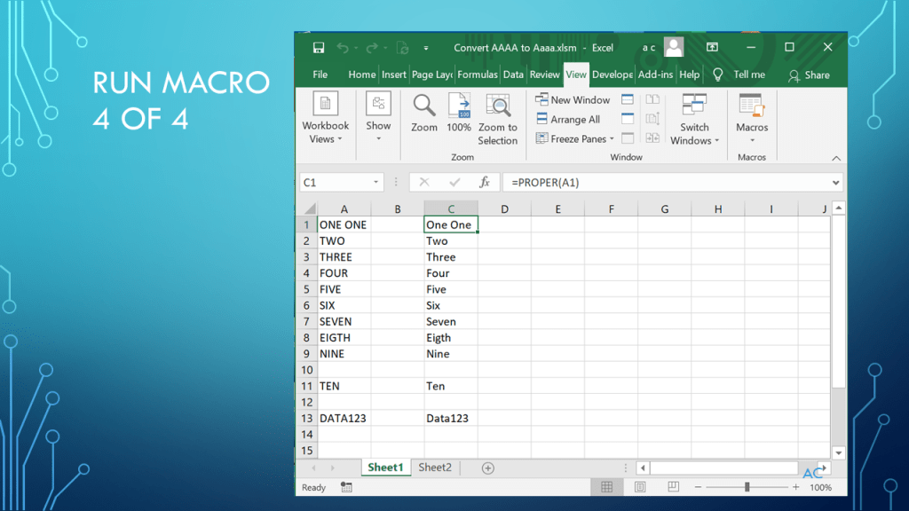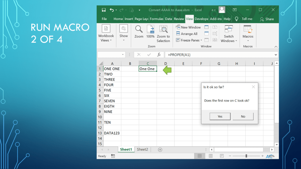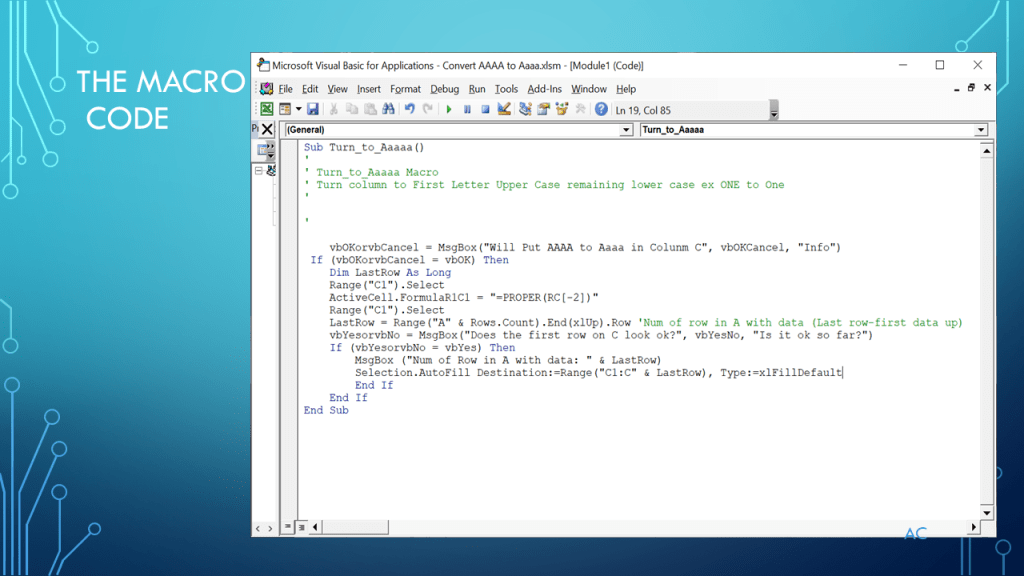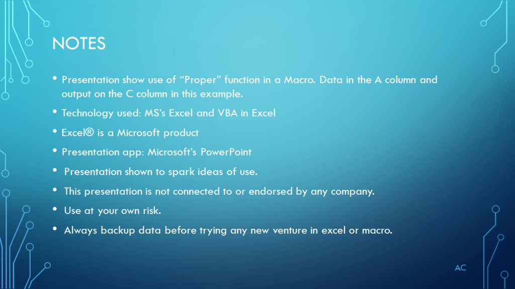 •Presentation show use of “Proper” function in a Macro. Data in the A column and output on the C column in this example.