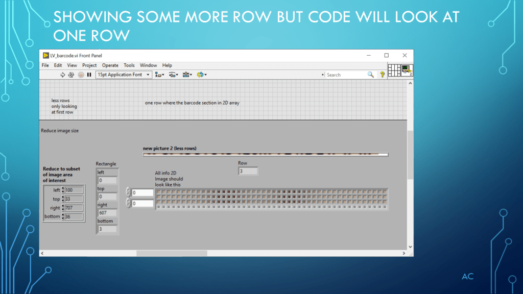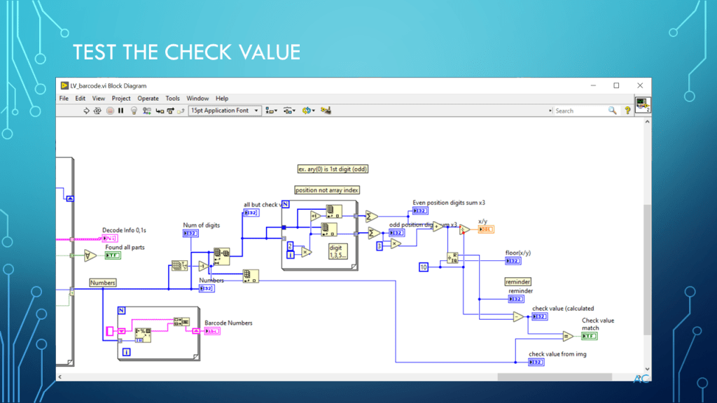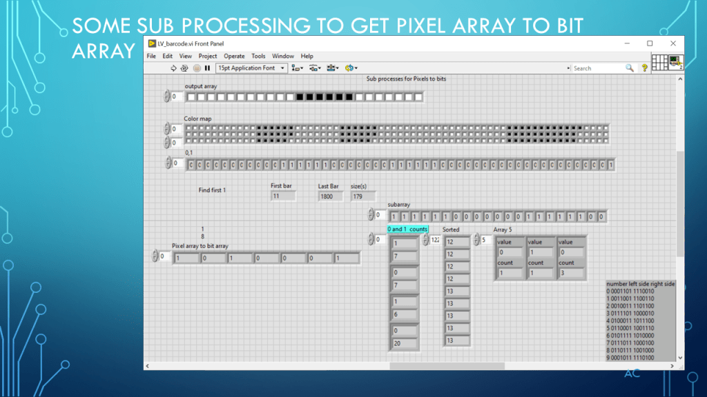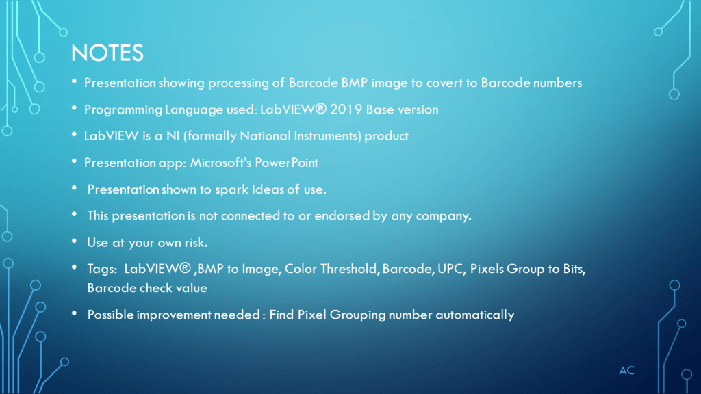 •Presentation showing processing of Barcode BMP image to covert to Barcode numbers •Programming Language used: LabVIEW® 2019 Base version