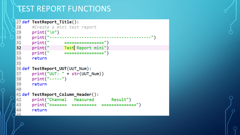 print(TestRpt['Channel']," ",TestRpt['MeasValue']," ",TestRpt['Result'])